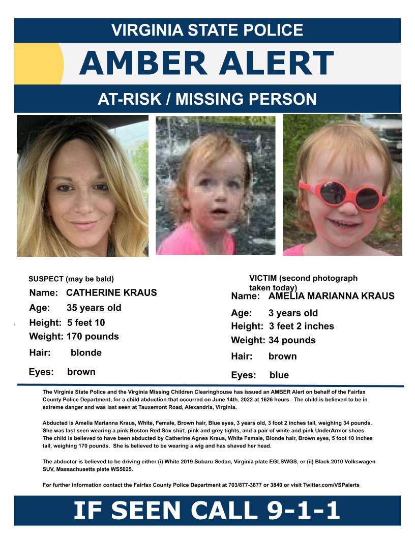 Md State Police On Twitter Amberalert On Behalf Of Virginia State Police An Amber Alert Is Being Activated For Amelia Kraus 3 Believed To Have Been Taken Forcibly By Her Non Custodial Mother